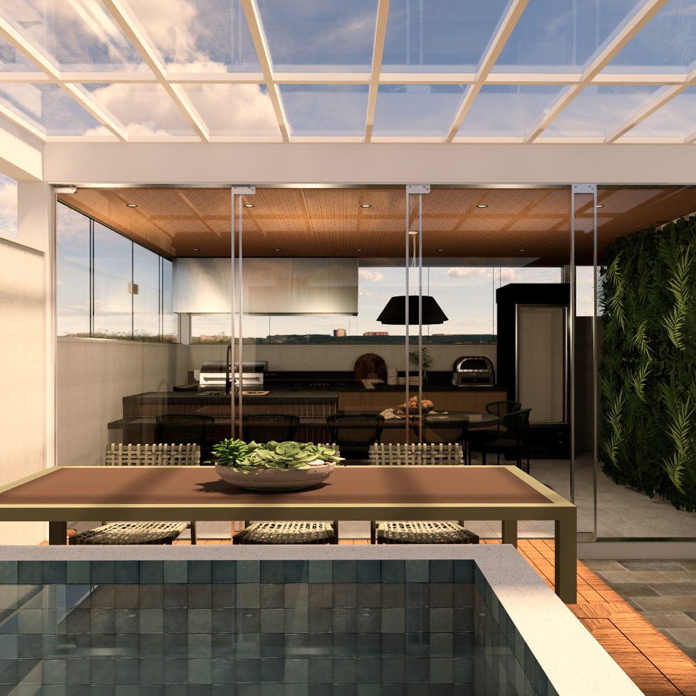 O apartamento Matipó contava com uma área privativa generosa e foi justamente ela que potencializou o interesse dos nossos clientes. Aqui, para aproveitarmos ao máximo a área externa, criamos varandas, ambientamos os corredores e criamos um espaço gourmet coberto que conta ainda com spa, ducha, deck e muito espaço para diversão e entretenimento.